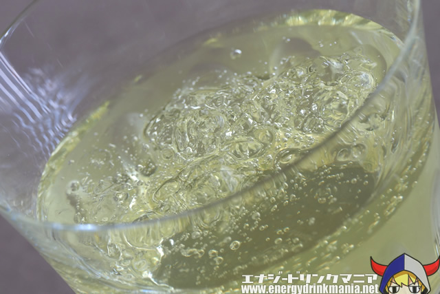 The liquid inside is a bright gold. The scent is not particularly strong, with a vitamin drink-like, old-fashioned Japanese energy drink chemical fragrance lingering in the air.