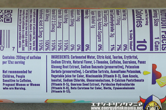 It contains 200mg of caffeine, taurine, theanine, ginseng, carnitine, inositol, glucuronolactone, and guarana.