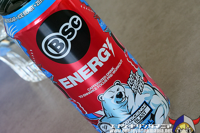 The front of the can features the large BSC logo, with an image of a bodybuilder bear representing the flavor. This animal character differs across the BSC ENERGY flavors, and for BSC ENERGY ICE BLAST, it’s a polar bear.