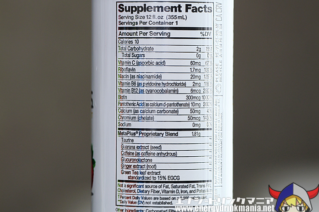 It contains 200mg of caffeine, taurine, guarana, glucuronolactone, ginger, and green tea.