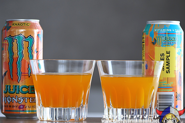 Here is the KHAOTIC from the UK. The orange is not as rich, and the overall hue is lighter and more vibrant. The fruit juice content is the same at 10%.