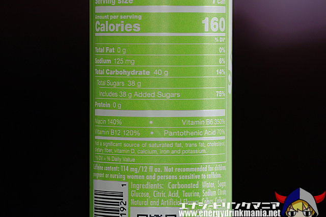 Contains 114mg of caffeine and 1420mg of taurine, which is a standard amount.