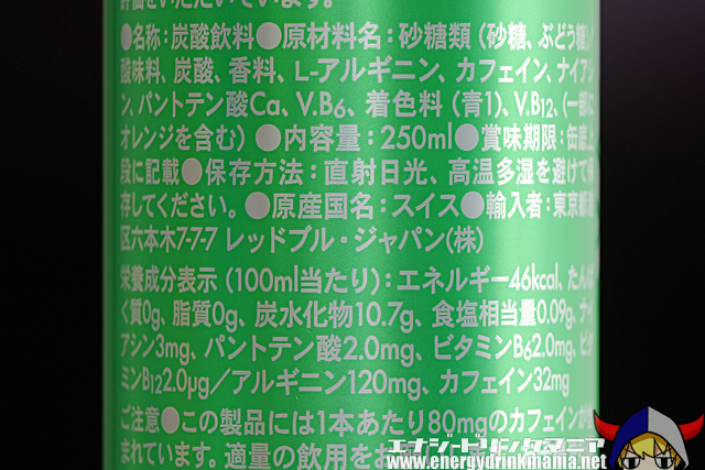 Energy Ingredients of Red Bull Summer Edition 2024 Lime (Japan)