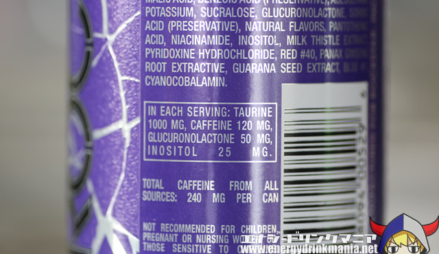 Caffeine 240mg, Taurine 2000mg, Glucuronolactone 100mg, Inositol 50mg, Panax ginseng, and guarana.