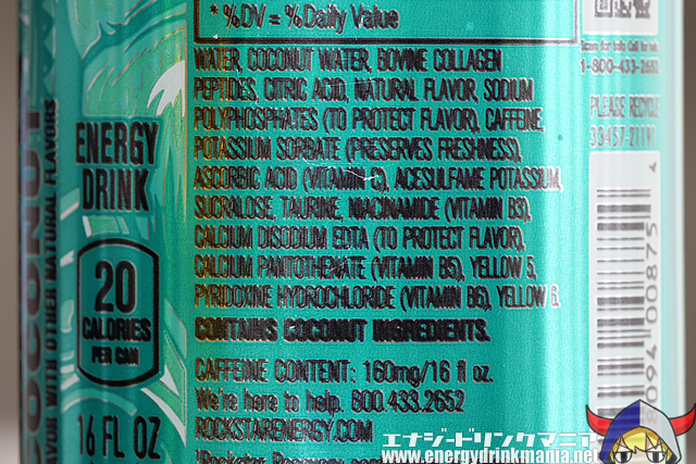 Contains 160mg of caffeine, taurine, and 3% coconut juice. It also has 3g of collagen, making it suitable as a collagen drink as well.