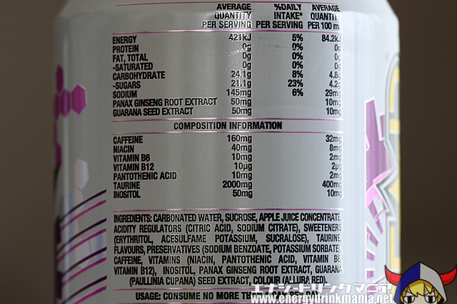 It contains 160mg of caffeine, 2000mg of taurine, 50mg of inositol, along with ginseng and guarana. These are standard energy ingredients. While the flavor didn't have any fruitiness, there is 5% apple juice included.