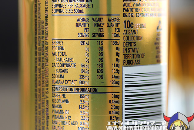カフェイン155mg、タウリン1000mg、ガラナ600mg、グルクロノラクトン125mg配合。標準的なVエナジーブレンドです。
